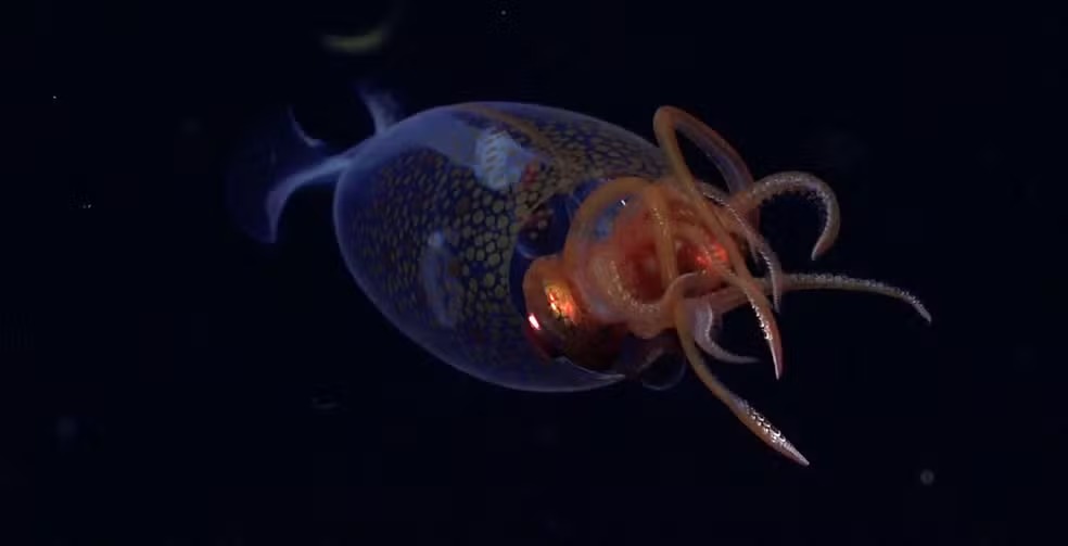 Imagens inéditas mostram um filhote da espécie, que mede apenas cerca de 30 centímetros. Quando adulta, a lula-colossal pode medir até 7 metros e pesar 500 kg, o que lhe rende o título de invertebrado mais pesado do planeta.