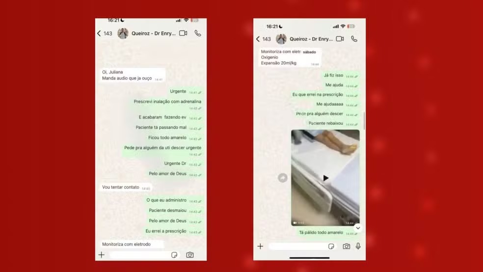 Mensagens, que circulam nas redes sociais, mostram a médica pedindo urgência a um colega, identificado como Enryko Garcia de Carvalho Queiroz, durante o atendimento.