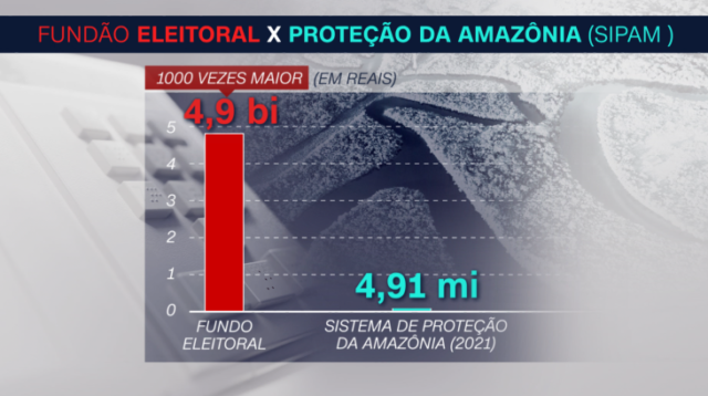 Ainda na área de segurança, os valores do Fundo Eleitoral são cerca de mil vezes superiores ao valor pago pelo governo federal em 2021 para manutenção do sistema de proteção à Amazônia – SIPAM, que é voltado ao planejamento e coordenação de ações de governo na Amazônia Legal brasileira.