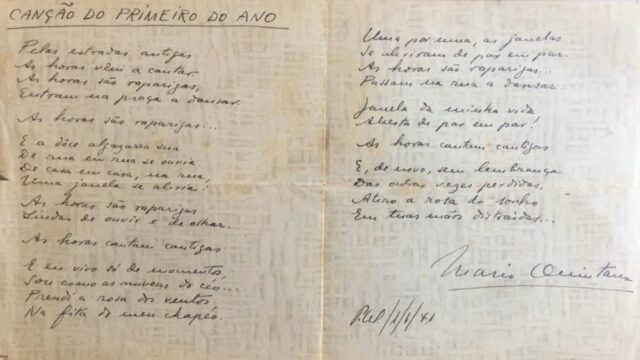 Um poema inédito assinado por Mario Quintana foi descoberto por um livreiro de Porto Alegre. O manuscrito de “Canção do Primeiro do Ano” foi encontrado por George Augusto dentro de um livro do poeta, adquirido de uma coleção particular composta por mais de 5 mil volumes. Leia o poema abaixo.