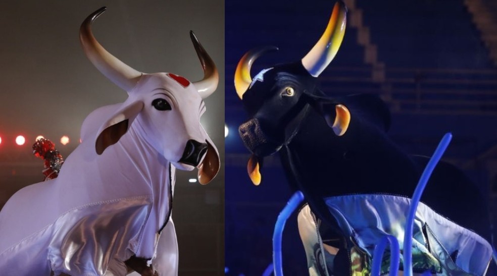 A histórica disputa entre o Boi Garantido (vermelho) e o Boi Caprichoso (azul) acontece há 57 edições em Parintins, conhecida como “Ilha da Magia”, a 369 km de Manaus.
