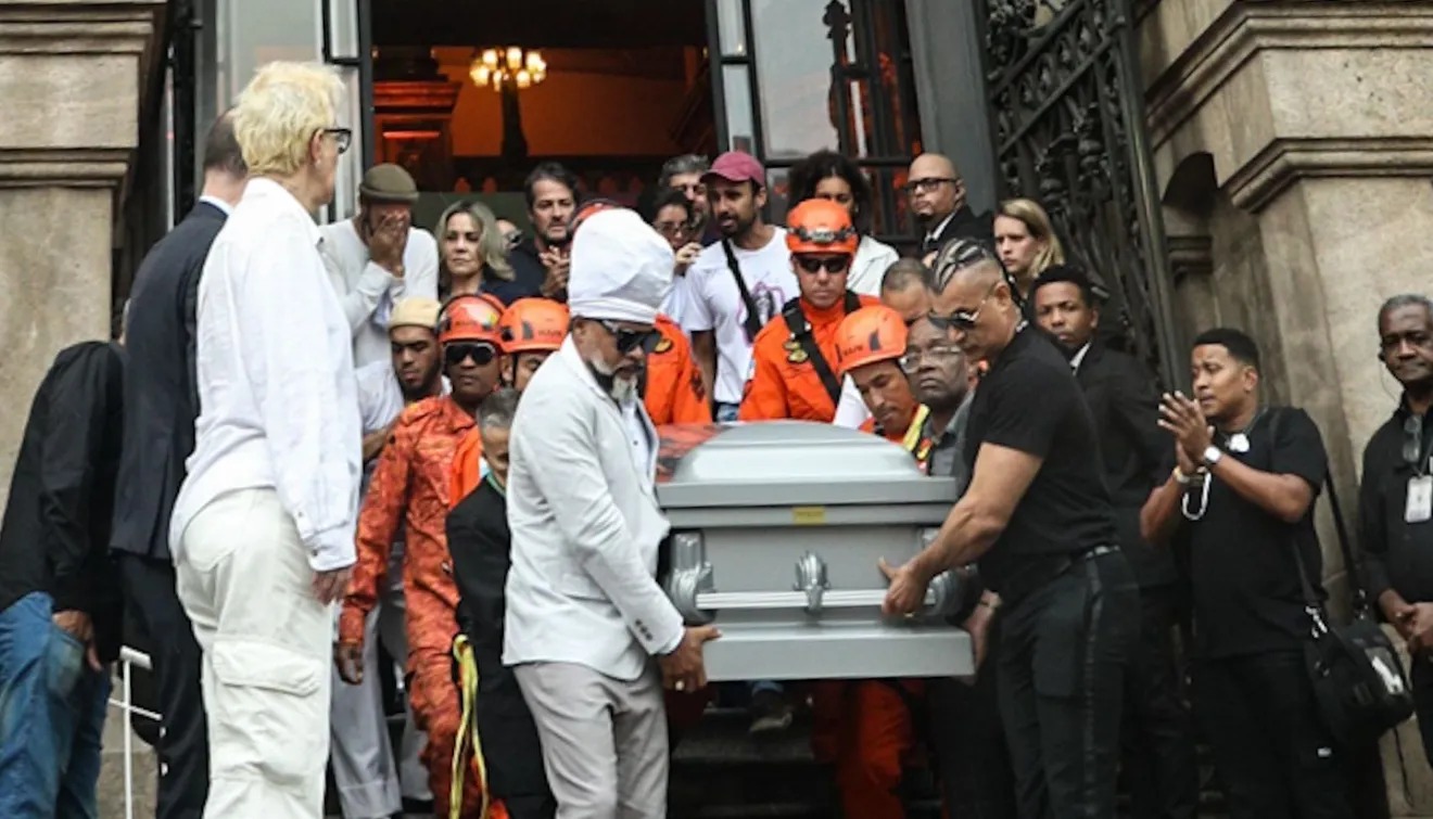 Francisco Gil, 30, o pai, Otávio Muller, 59, e o cantor Carlinhos Brown, 62, carregaram o caixão de Preta Gil, 50, na saída do velório, que aconteceu no Theatro Municipal, no Rio de Janeiro.