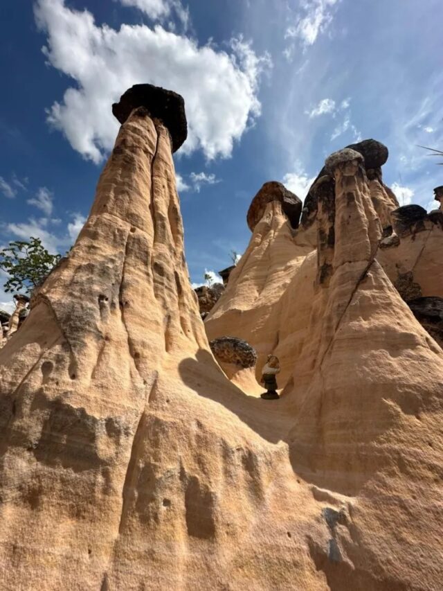 Joana destacou: “Essas formações surgem porque a rocha inferior é mais macia que a camada superior, que atua como uma espécie de “tampa” protegendo o topo do tótem. Diferentemente de outras chaminés de fada conhecidas, geralmente formadas por rochas vulcânicas sobre tufos, as dessa região têm origem sedimentar. Elas se formaram em um antigo leito de rio que secou, e, graças à atual desertificação, permanecem preservadas, já que não há mais fluxo de água suficiente para erodi-las”.