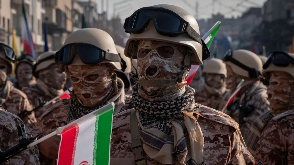 Integrante armado da Guarda Revolucionária Islâmica do Irã observa enquanto aguarda para participar de uma manifestação militar no centro de Teerã • Morteza Nikoubazl/NurPhoto via Getty Images
